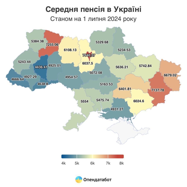 Найвищу середню пенсію незмінно отримують у Києві — 7 940 грн, а найнижчу — на Тернопільщині: 4 436 грн.