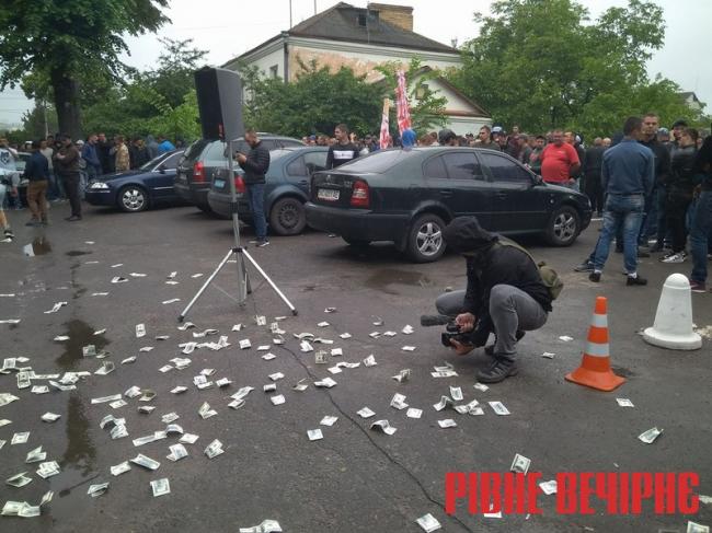 Насамкінець пікетувальники демонстративно розкидали біля поліції сотні несправжніх доларів і пообіцяли, якщо їх не почують, то вони перекриють трасу міжнародного значення Київ-Чоп.