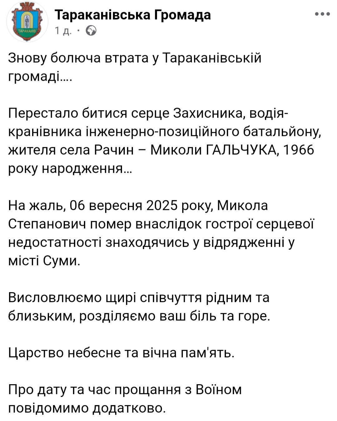 Новини Перестало битися серце захисника з Рівненщини Микола Гальчук помер під час відрядження у місті Суми. admin 7 Вересня 2025, 16:30 0 хв. читання Поділитися Про смерть земляка сповістили у Тараканівській громаді. «Зірковий вертеп» зібрав понад 100 тисяч гривень на підтримку поранених воїнів Рівнян запрошують на «Різдвяні піснеспіви» Майже сім років у суді: Мічуда впевнений, що його справу врешті-решт «поховають» Колишній речник голови Рівненської ОВА показав, як поцілили у його будинок Стало відомо про загибель ще одного бійця з Рівненщини Поділитися цією статтею Facebook Telegram Копіювати посилання Приєднуйтесь 58KСтежити1.2KСтежити13.9KСтежити6.1KПідписатися Читайте нас у Telegram: тільки важливі та перевірені новини Новини 27 Грудня 2025 «Зірковий вертеп» зібрав понад 100 тисяч гривень на підтримку поранених воїнів 22:15 Рівнян запрошують на «Різдвяні піснеспіви» 21:35 Майже сім років у суді: Мічуда впевнений, що його справу врешті-решт «поховають» 21:00 Колишній речник голови Рівненської ОВА показав, як поцілили у його будинок 20:30 Стало відомо про загибель ще одного бійця з Рівненщини 20:05 З України зараз більше виїжджають, ніж навпаки 19:30 Холодець: одним це користь, іншим — нашкодить 19:00 У Рівному оштрафували торговців, які продавали ялинки «не там» 18:30 Кожен вибух все ближче. Напевно, нас рятувала молитва, — поліцейський з Рівненщини на псевдо «Татарин» 18:00 Ворог влучив у ТЕЦ та б’є по видобутку газу 17:25 Всі новини