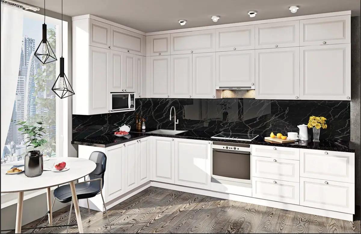 Кутові комплекти ставлять між суміжними стінами, що дає можливість максимально залучити простір кухні. При цьому легко скомпонувати деталі так, що все необхідне буде дуже близько та зручно для господарів. Можна підібрати Г-подібні чи П-подібні моделі. Таке розташування полегшує кухонну роботу, допомагає заощадити час під час приготування їжі.
