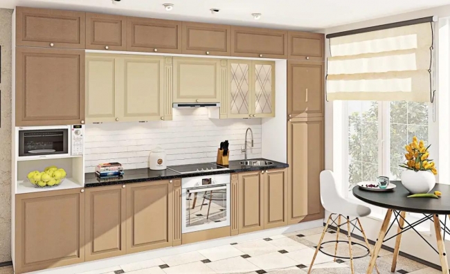 Залежно від побажань та особливостей приміщення, підбирають прямий чи кутовий комплект. У першому випадку гарнітур розміщується вздовж однієї стіни. Лінійне розташування не потребує додаткових витрат на переобладнання комунікацій. Це класичний варіант, який використовується у більшості прямокутних кімнат. Великий асортимент секційних гарнітурів дозволяє підібрати обстановку в будь-якому дизайнерському стилі.