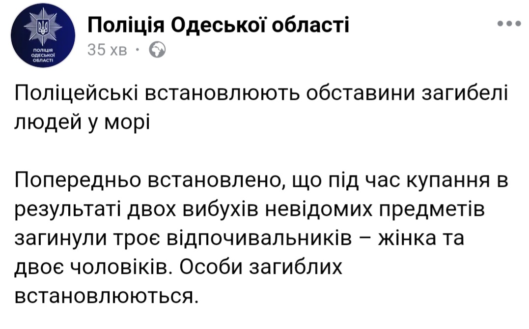 Як повідомили у поліції Одещини, загинули жінка та двоє чоловіків. Було два вибухи. На місці працюють слідчі, рятувальники та вибухотехніки.