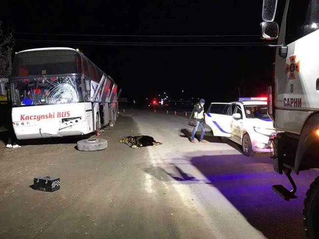 Під колесом автобусу опинився водій скутера. До місця події було направлено чергове відділення бійців 8-ї державної пожежно-рятувальної частини міста Сарни. Рятувальники за допомогою спецобладнення зняли колесо та дістали потерпілого. Лікарі констатували смерть 32-річного скутериста. Усі обставини ДТП з’ясовують працівники поліції.