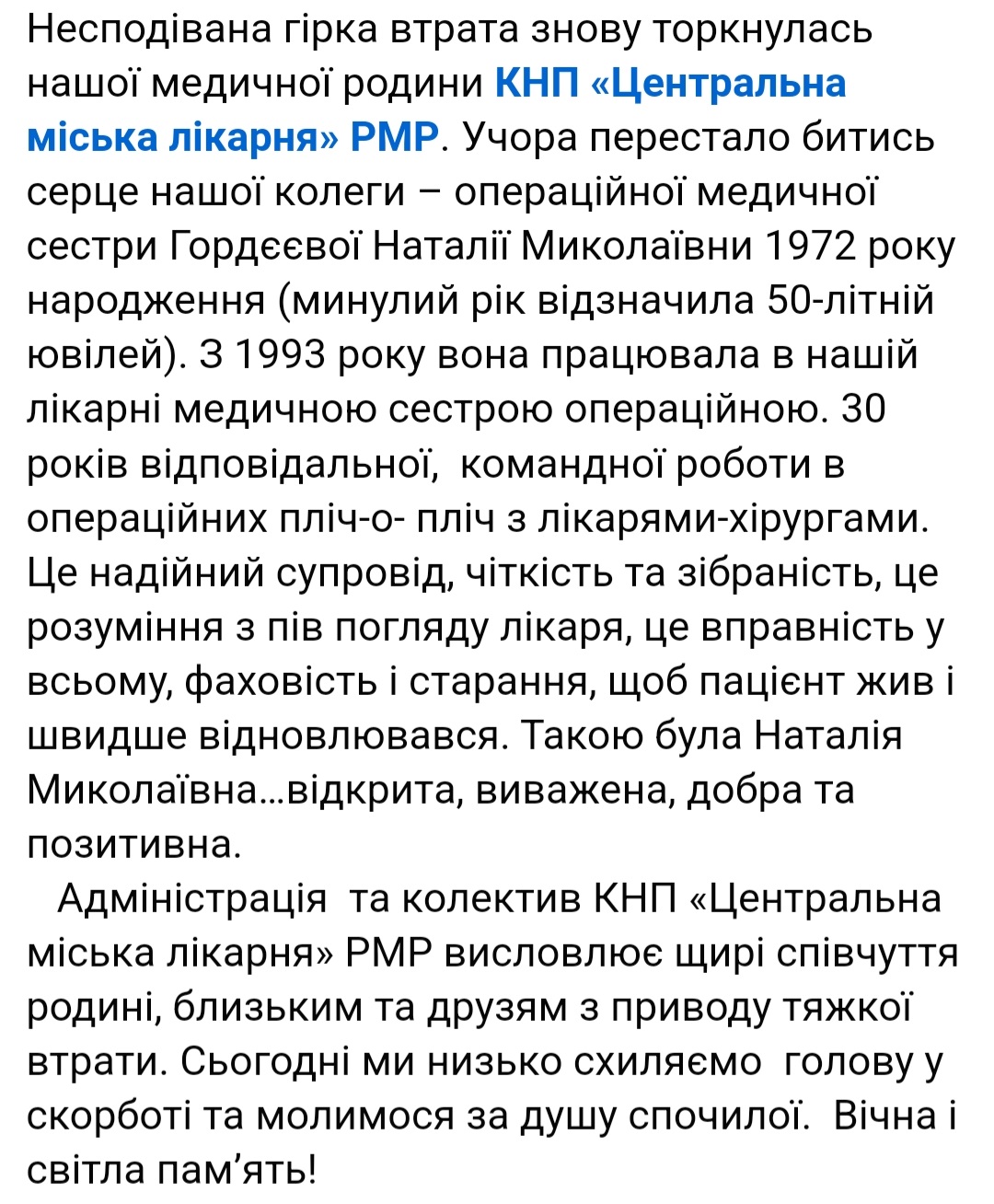 Нагадаємо, нещодавно померла інша медсестра цього ж закладу, яка пропрацювала у Рівненській ЦМЛ 46 років – Клавдія Мудрик.
