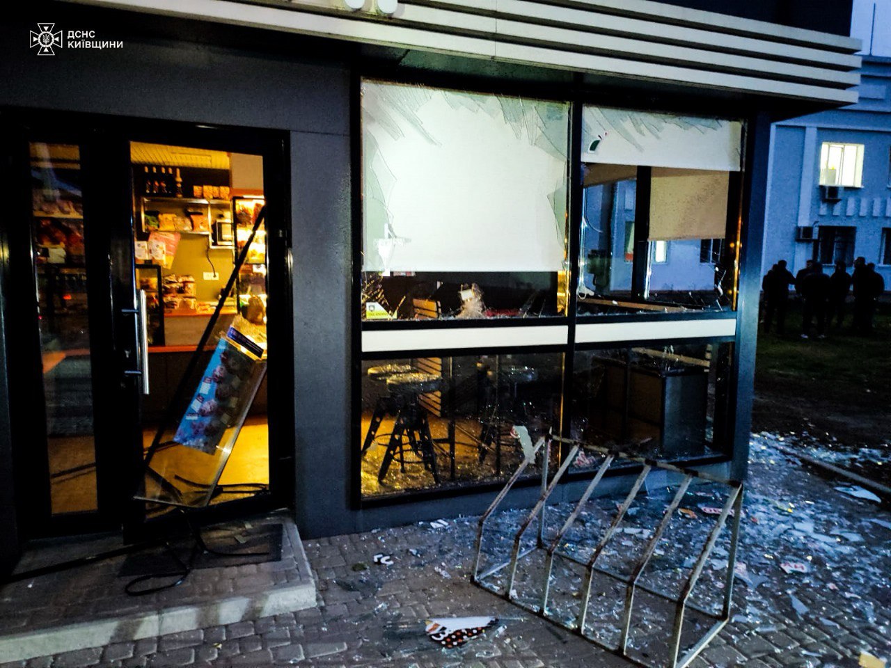 Очільник Київської ОВА Руслан Кравченко уточнив, що в області пошкодження 15 приватних будинків, 3 магазинів, одного багатоквартирного будинку та 3 підсобних приміщень в 4 районах області. Пошкоджено три автомобілі, лінію електропередач.
