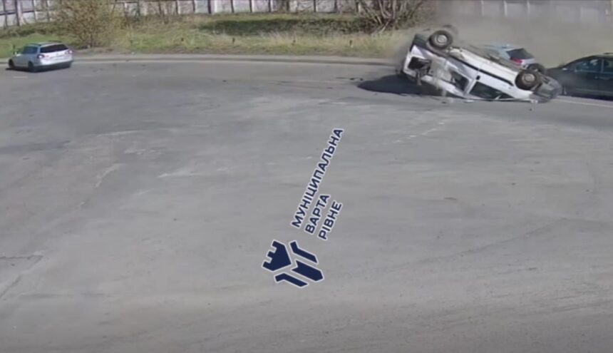 На записі видно те, як під час виїзду на головну дорогу легкове авто підбиває інший автомобіль. В результаті удару фургон занесло і той перекинувся.