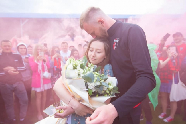 Захисник рівненського клубу Дмитро Махнєв на очах у вболівальників освідчився своїй коханій. Та відповіла згодою вийти за нього заміж.