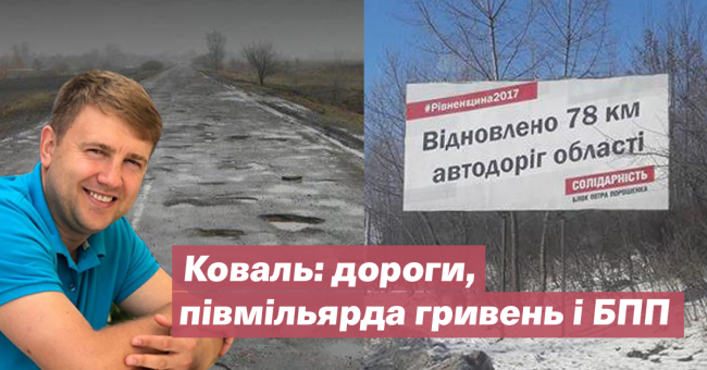 Окремої теми заслуговує якість виконаного ремонту доріг компанією “ВВВ Монтаж”. За останніх пів року роботи проводилися винятково під вибори, а на відкритті були кандидати від старої системи. До слова, компанія Віталія Коваля має десятки контрактів у Сарненському районі на суму більше 20 мільйонів гривень. Цей район належить до 156 виборчого округу, де балотувався член БПП і куратор Коваля Олександр Данильчук. Результати роботи компанії можливого голови Рівненської ОДА Віталія Коваля можна оцінити, проїхавшись дорогами Рівненщини.