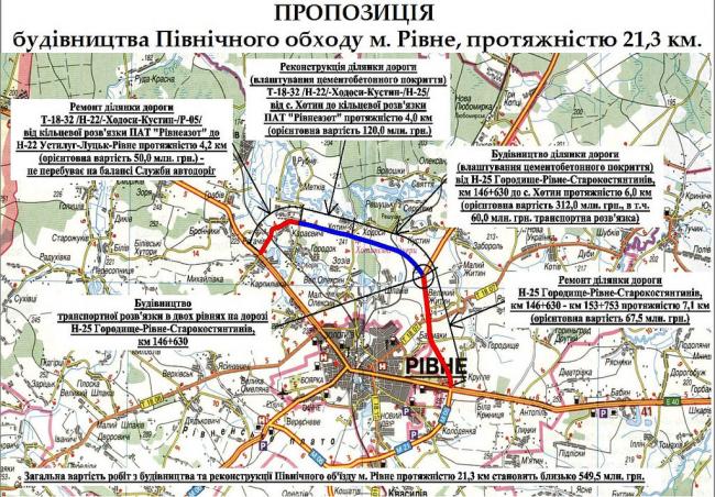 Нагадаємо, що ідею будівництва цієї об’їзної обласні чиновники поділилися з членами бюджетного комітету Верховної Ради, які приїздили на Рівненщину на початку грудня. Тоді нардепів дуже просили посприяти в отримані 540 мільйонів гривень із державного бюджету на будівництво північного об’їзду. Однак конкретної відповіді тоді не почули. Депутати лише заявили, що підтримують «дорожню стратегію Рівненщини». І кожен тепер тлумачить ці слова по-своєму.