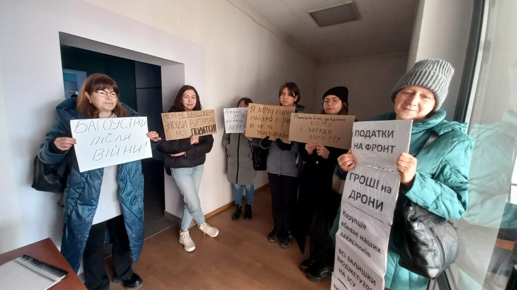 Тим часом при вході до сесійної зали на міських обранців знову чекали активісти з плакатами, які вимагають більше коштів виділяти на підтримку ЗСУ.