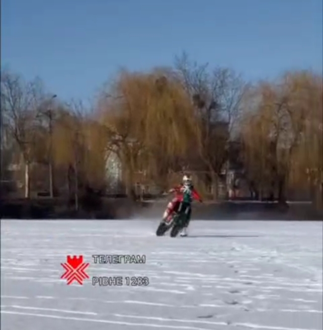 Очевидці зазняли на відео, як замерзлою поверхнею намотував кола мотоцикліст.