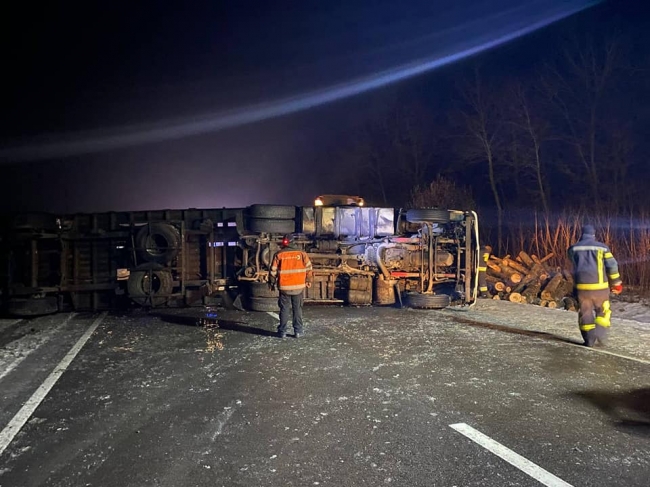 Рятувальники спільно з поліцейськими вручну звільнили дорогу від колод. Потому за допомогою важкої інженерної техніки вантажний автомобіль було поставлено на колеса та відбусировано з проїжджої частини дороги.