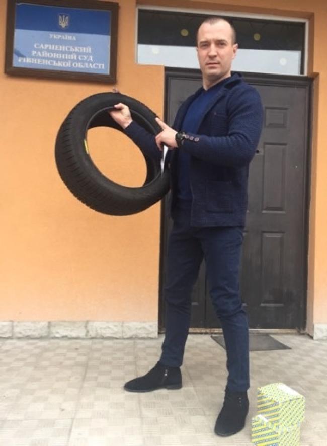 Нагадаємо, що патрульні зробили винним водія за те, що той дорогою з Сарн вскочив у яму і пробив колесо, а в результаті залишився без посвідчення водія. Рішення ухвалив Сарненський районний суд. Під його стінами водій вшатував цілий флеш-моб із шинами. У своїй правоті Юрій Гриневич, який вже міняє за цю зиму четверте колесо, не сумнівався. Та не зважаючи на рішення суді, у патрульній поліції і далі настоюють на своїй правоті: