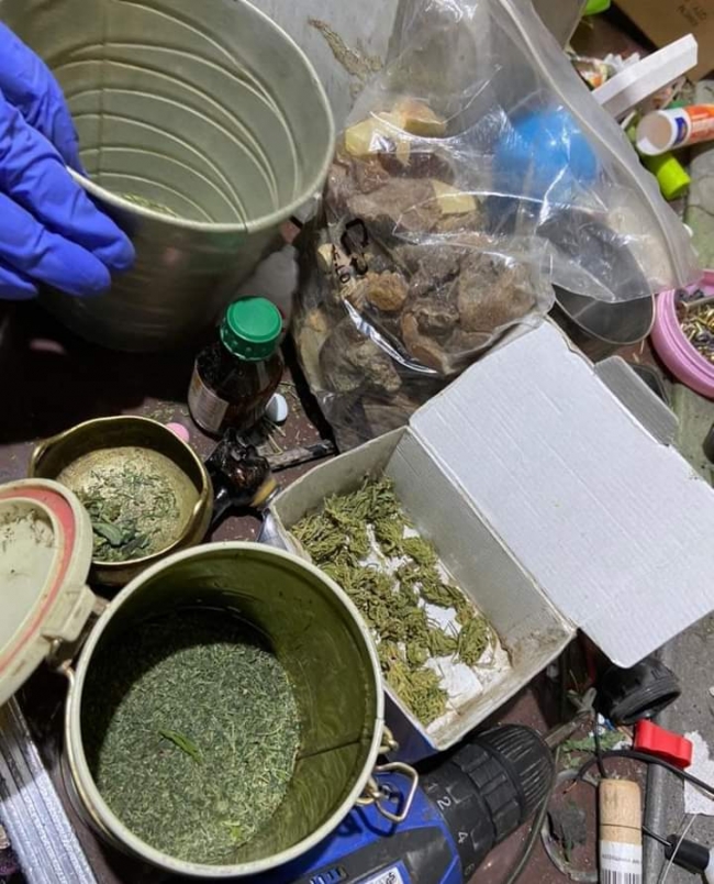 Поліцейські виявили та вилучили канабіс, саморобні пристрої для куріння, прозорий пакет з порошком білого кольору, пристрій для куріння, поліетиленовий пакет з камінням бурштину-сирцю вагою близько 1 кг, три мобільні телефони, 4600 гривень, пластмасову коробку з білою порошкоподібною речовиною, електронну вагу, патрони, ін’єкційні шприци, голки та чорнові записи.