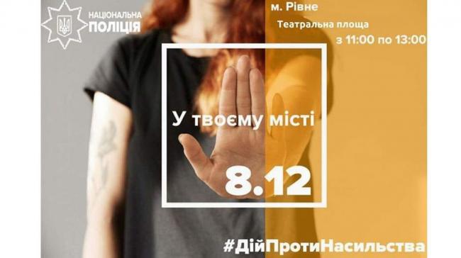 Під час заходу, який проходитиме 8 грудня на Театральній площі у Рівному, усі охочі зможуть дізнатися про види домашнього насильства, можливі дії при будь-яких його проявах, про поліцейські заходи під час реагування на домашнє насильство.