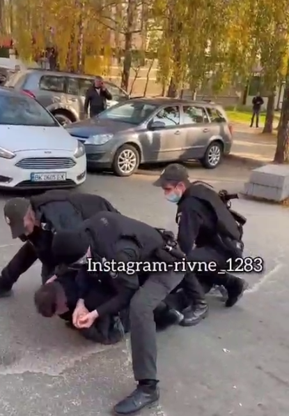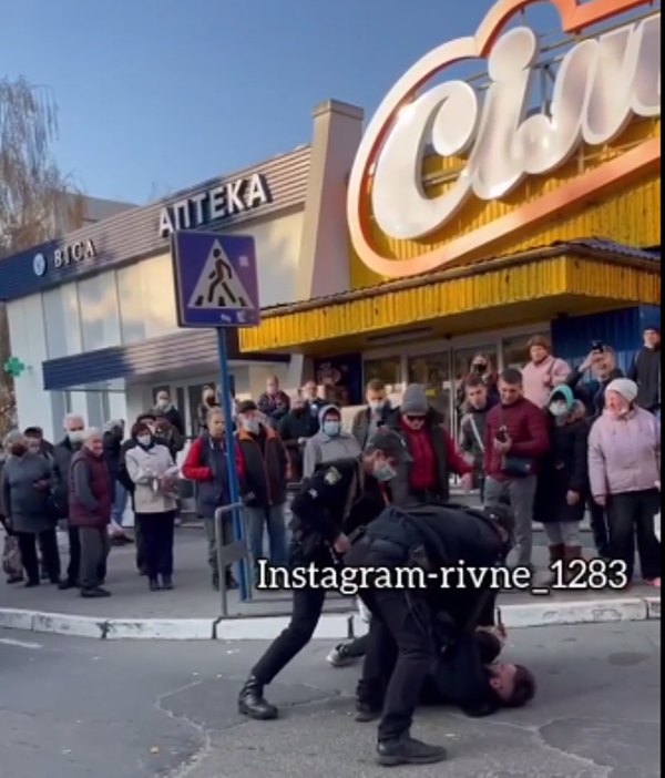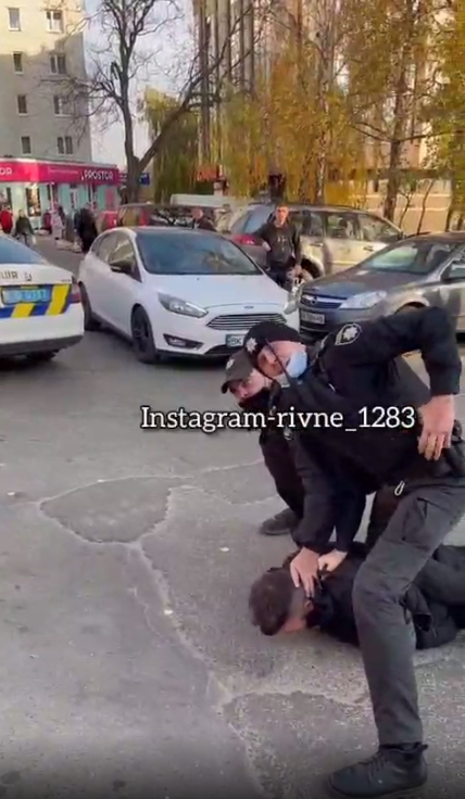 Очевидці повідомляють в інстаграм-спільноті rivne_1283, що поліцейські затримали чоловіка за спробу крадіжки. Дехто просить, щоб хлопці його відпустили. Сам затриманий лається. Вочевиль, йому дуже боляче таким чином опинитися на землі. Троє поліцейських ледь з ним зуміли впоратись. Виявилось, що там затримували не одного, а двох чоловіків.