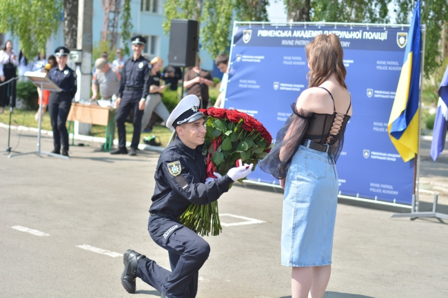 Захід не обійшовся без сюрпризів, повідомляє Рівненська академія патрульної поліції. Один із здобувачів освіти, а тепер уже випускник, освідчився своїй коханій. І вона сказала: “Так!”. Любов перемагає все, і навіть війну.