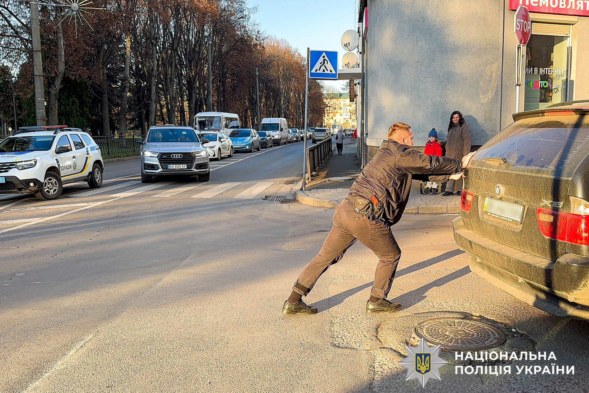 Правоохоронець заспокоїв родину та перевірив, що машина дійсно не заводиться. Після цього він самотужки виштовхав кросовер із перехрестя, звільнивши дорогу для інших автомобілів.