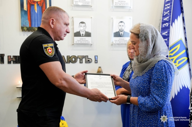 Чергове спеціальне звання старший лейтенант поліції посмертно начальник ГУНП Віктор Шанський вручив мамі загиблого Андрія Павлюка — Надії Леонідівні. Відповідний наказ підписав голова Нацполіції Іван Вигівський.