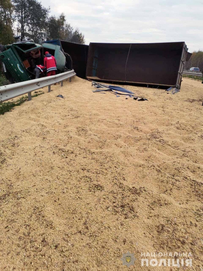 На місці події слідчий слідчого управління встановив, що водій вантажівки «КамАЗ» із напівпричепом, завантаженим соєю, допустив виїзд за межі проїзної частини, в результаті чого допустив перекидання транспортного засобу. Водій вантажівки загинув на місці події.