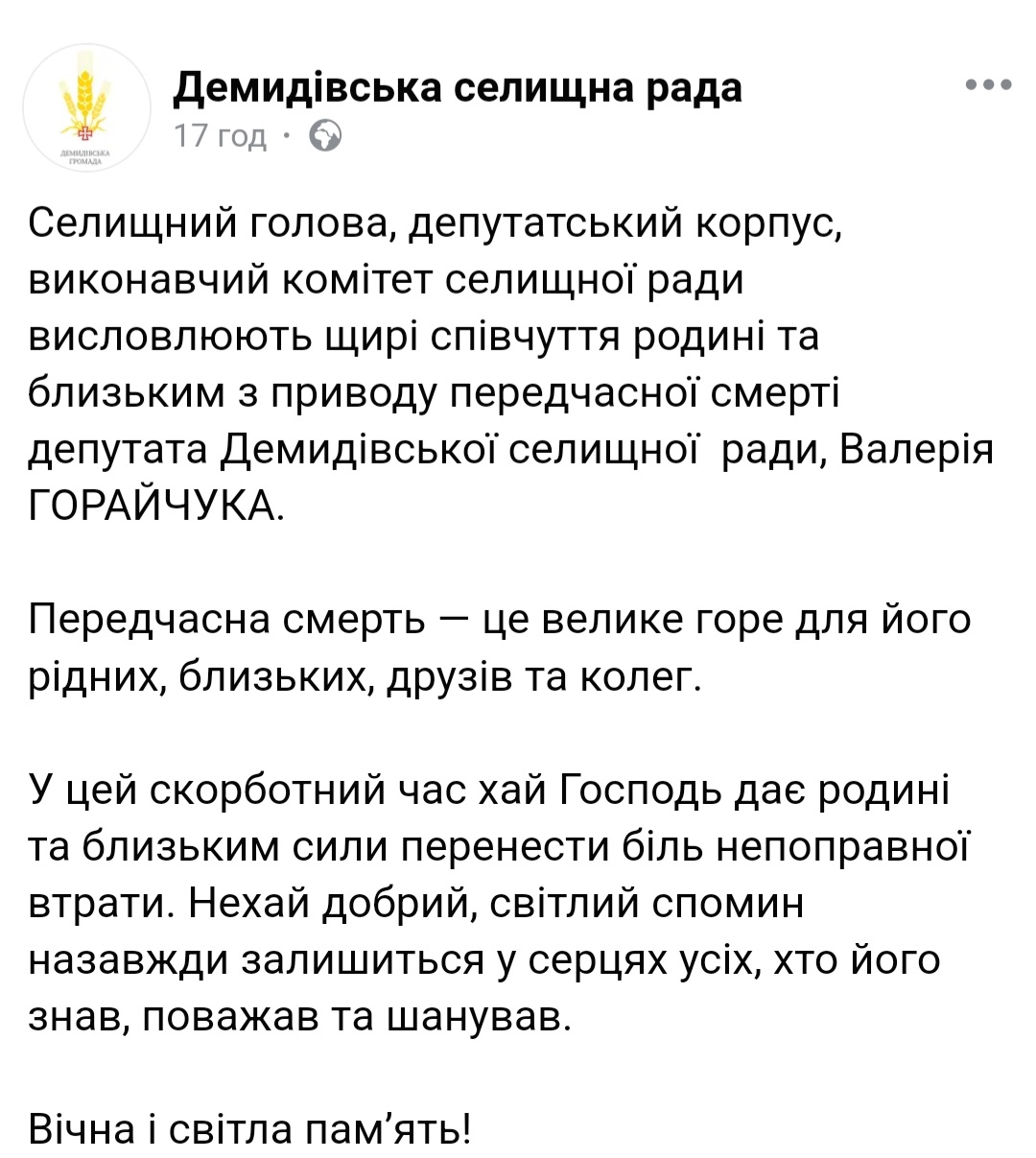 Новини Помер депутат з Рівненщини Обірвалося життя Валерія Горайчука. admin 20 Вересня 2024, 10:20 0 хв. читання Поділитися Повідомили про це у Демидівській громаді. Тролейбусну лінію на Північному продовжать Їжа для настрою Подробиці аварії у Білій Криниці: хто відповідатиме? У Рівному відкрили справу проти матері: соцслужби вилучили немовля У центрі Рівного потрійна ДТП Поділитися цією статтею Facebook Telegram Копіювати посилання Приєднуйтесь 58KСтежити1.2KСтежити13.9KСтежити6.1KПідписатися Читайте нас у Telegram: тільки важливі та перевірені новини Новини 20 Грудня 2025 У супутника Starlink — аварія на орбіті Тролейбусну лінію на Північному продовжать 21:00 Їжа для настрою 20:46 На Рівненщині побільшало звернень до Центру з розшуку безвісти зниклих: з чим приходять люди 18:03 Подробиці аварії у Білій Криниці: хто відповідатиме? У Рівному відкрили справу проти матері: соцслужби вилучили немовля 18:35 У центрі Рівного потрійна ДТП Путін не вважає себе винним за вбивства українців 15:42 На Різдво й Новий рік на Рівненщині можливий сніг і морози 17:11 Супермаркети готуються до зростання цін на яйця 16:18 Всі новини