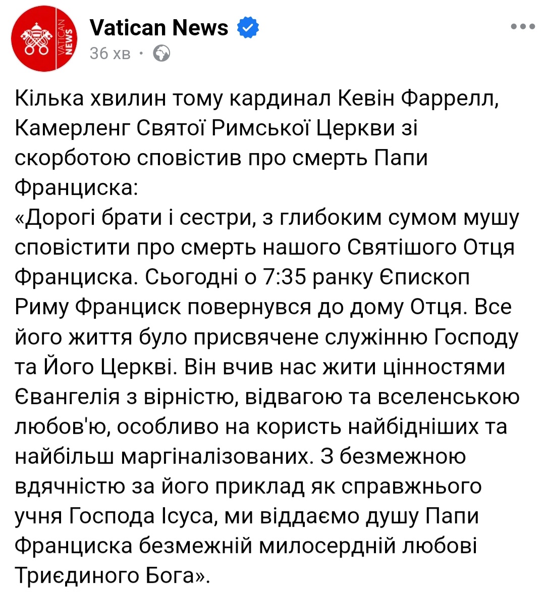 Папа Римський Франциск помер у віці 88 років, перед тим він важко хворів. Як додає ТСН, за порадою лікарів понтифік не очолив традиційну великодню месу у Ватикані, але з’явився наприкінці заходу з посланням, відомим як «Urbi et Orbi» («Місту і світу»), яке зачитував від його імені кардинал Анджело Комастрі.