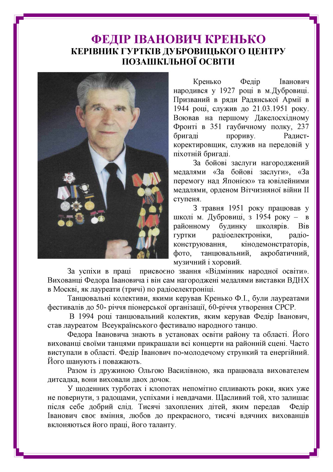 Нагадаємо, Федора Кренька називали дубровицьким унікумом, адже міг одночасно вести до десятка різних гуртків — танцювальний, хоровий, акробатики, баяністів, радіоконструювання, радіоелектроніки, фотосправи, кінодемонстраторів. Його вистачало для всіх: він був мудрим, але вимогливим, до учнів ставився із незмінними терпінням і любов’ю, по–батьківськи звертаючись до них «синку» чи «дочко»..