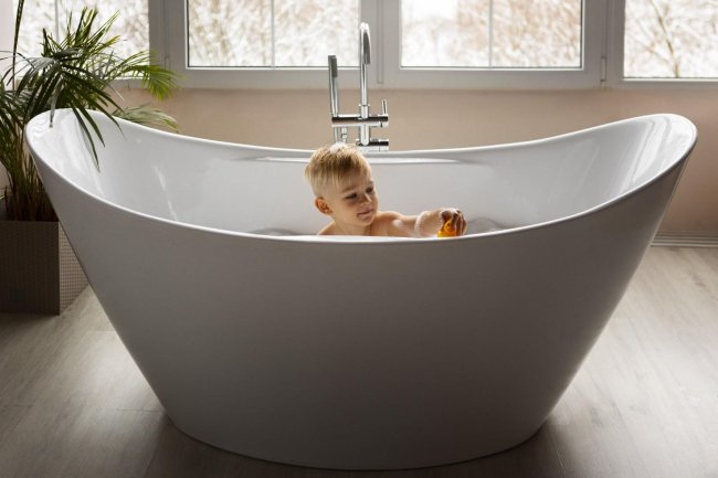 - Вид монтажу. Кутові ванни дозволяють зекономити місце в маленьких кімнатах. Просторе приміщення краще облаштувати вільностоячою ванною овальної форми. Для пристінного монтажу підійдуть прямокутні моделі на регульованих ніжках.