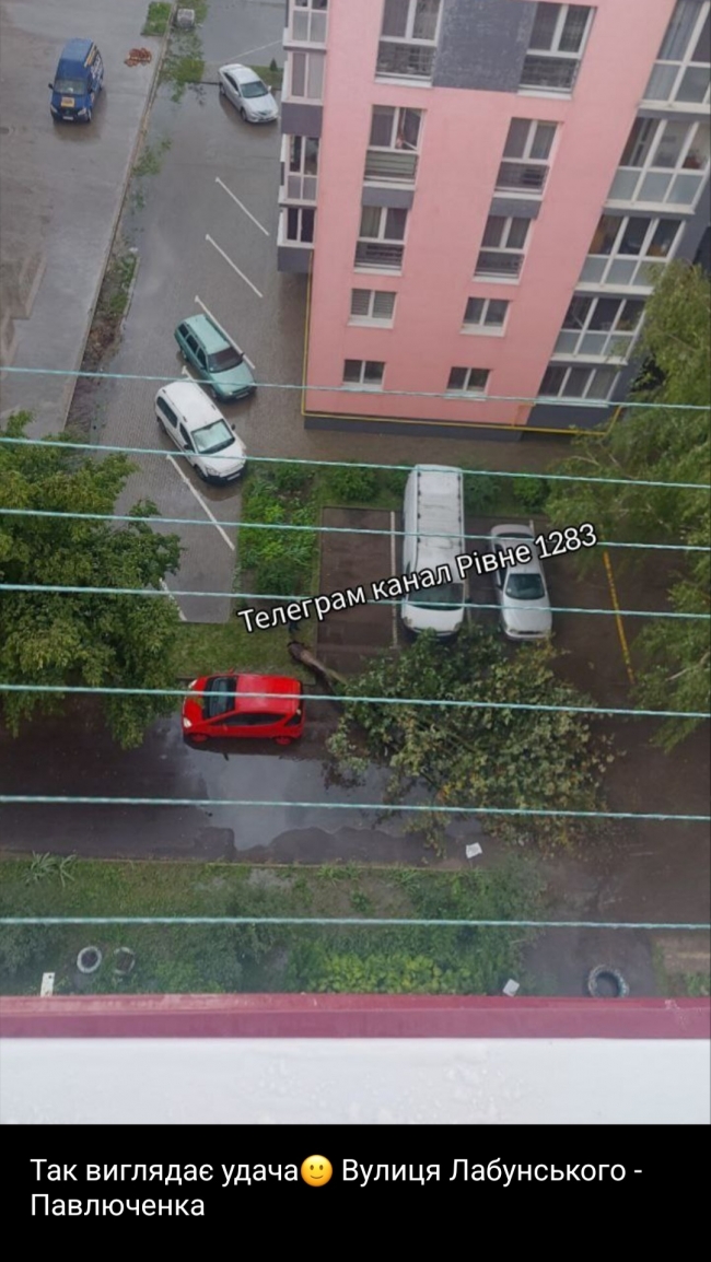 У місцевому телеграм-каналі Рівне 1283 виклали фото поваленого негодою дерева – під вікнами житлових будинків на одній з вулиць міста. Як зазняли очевидці, стовбур не зачепив жоден із прапаркованих автомобілів. Та й з перехожих у цей момент поблизу нікого не було.