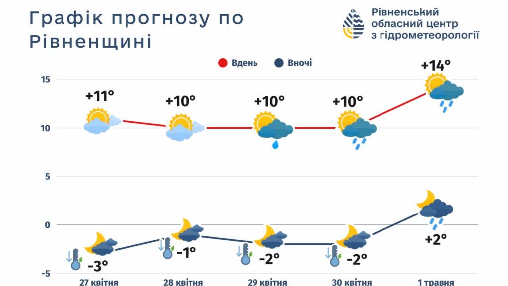 29 квітня, середа: мінлива хмарність. Вночі без істотних опадів. Вдень невеликий дощ. Вітер північно-східний, 7-12 м/с. Температура: вночі заморозки 0-3°, вдень 7-12° тепла.