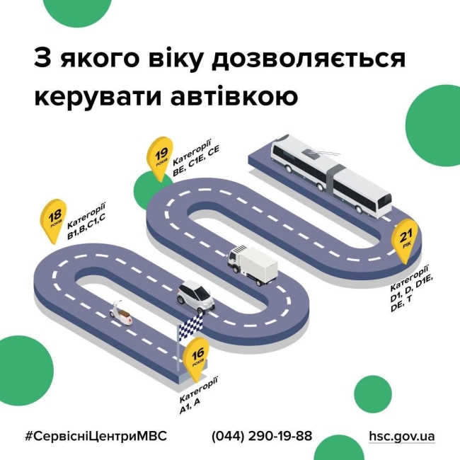 Отже, в Україні починаючи з 16 років можливо проходити навчання та отримати посвідчення водія. Але це стосується транспортних засобів тільки категорій А та А1, тобто мопедом чи мотоциклом. А керування вантажівкою з причепом – з 19 років, а тролейбусом чи трамваєм – з 21 року.