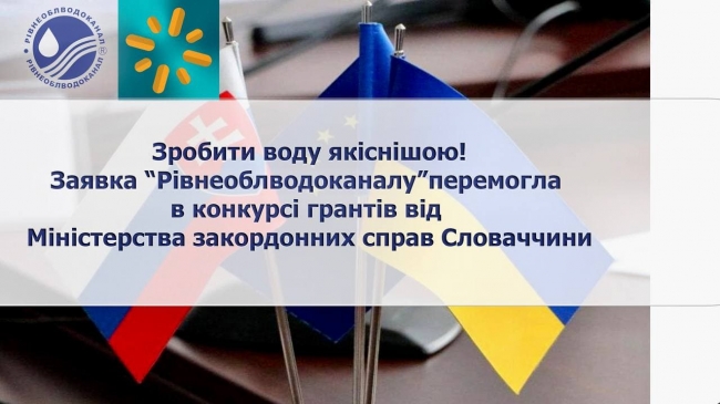 Конкурс був оголошений Міністерством закордонних справ Словаччини та Словацькою агенцією з міжнародного співробітництва та розвитку (SlovakAid). Номер проекту: SAMRS/2021/UA/1/5. Конкурсна заявка «Безпечна вода для міста Рівне» стала однією з двох переможців серед 14 проєктів, здобула найвищий бал (95 із 100) та отримала 2/3 загального бюджету конкурсу – 199 373 євро.