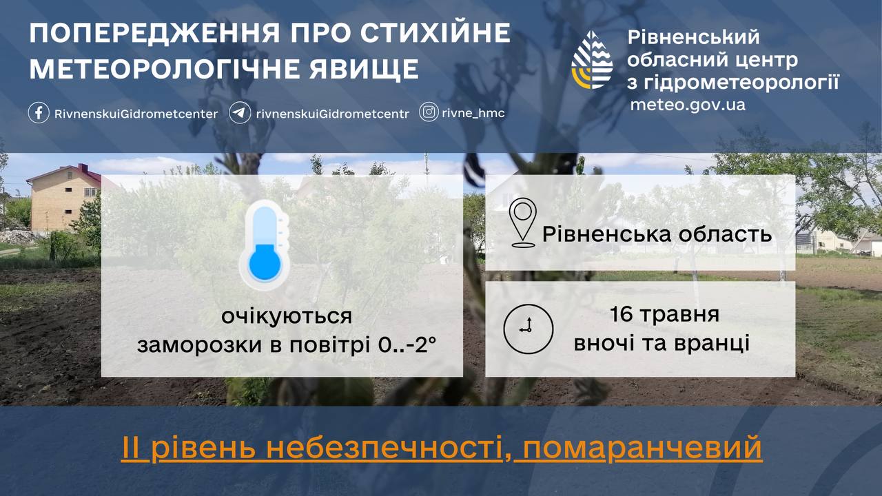– Вночі та вранці 16 травня очікуються заморозки в повітрі 0..-2º, ІІ рівень небезпечності – помаранчевий. Заморозки в повітрі можуть спричинити пошкодження плодових дерев, овочевих та ягідних культур, – додають синоптики.