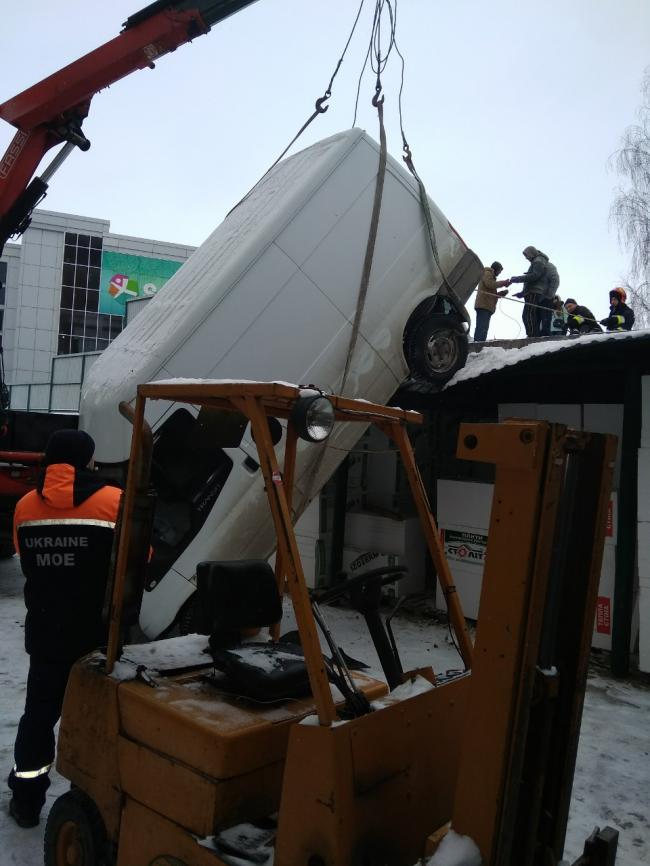 Ця автопригода сталася сьогодні на вулиці Коновальця у Рівному. Поблизу магазину «Століт» мікроавтобус скотився і впав з триметрової висоти. Без рятувальників впоратись з ним не змогли.