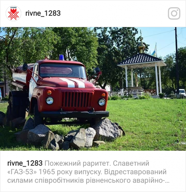 Пожежний раритет. Славетний «ГАЗ-53» 1965 року випуску. Відреставрований парцівниками рівненського аварійно-рятувального загону спецпризначення. Понад 40 років служив він надійним «залізним конем» для сільських вогнеборців у кількох районах області. Не одна сотня пожеж була ліквідована за його допомогою. “Бойого товариша” у брухт не здали, а реставрували, перетворивши на музейний експонат.