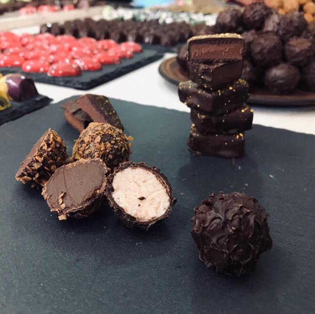 На світлинах оприлюднила корпусні шоколадні цукерки: кокос з білим шоколадом; молочний шоколад з праліне; арахіс з малиновим мармеладом та чорний шоколад з кавою, а також трюфелі з чорним шоколадом і віски та з полуницею на білому шоколаді.