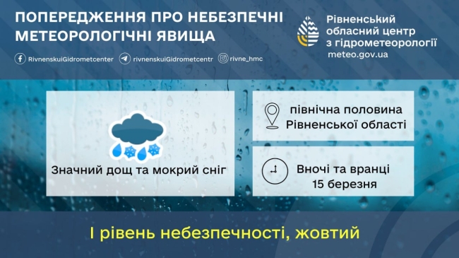15 березня, субота: хмарно з проясненнями. Вночі та вранці в північній половині області значний дощ та мокрий сніг, слабке налипання мокрого снігу, на окремих ділянках доріг ожеледиця. Вночі в південній половині помірний дощ. Вдень невеликий дощ і сніг. Вітер північний, північно-східний, 7-12 м/с. Температура вночі 0-5º тепла, вдень 2-7° тепла. Атмосферний тиск буде слабо рости.