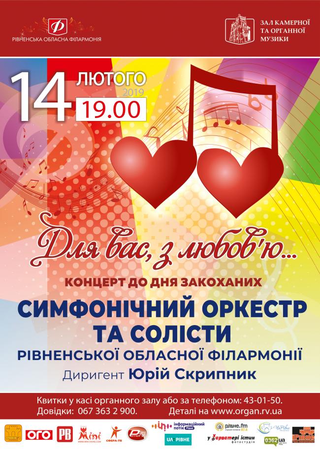 14 лютого, до Дня закоханих, відбудеться концерт симфонічного оркестру та солістів Рівненської обласної філармонії.