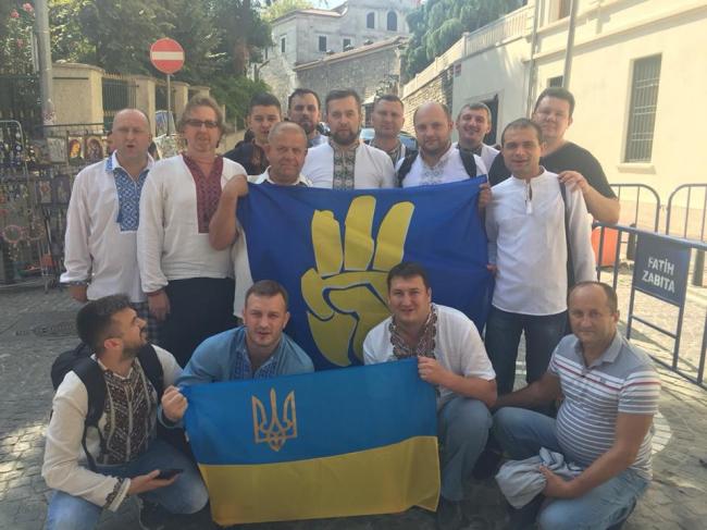 На вулицях Стамбула «свободівці» розгорнули прапор України та прапор своєї партії, а також плакати з закликами надати Томос про автокефалію Українській православній церкві.
