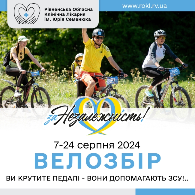 Вже 24 серпня відбудеться третій традиційний Благодійний Велопробіг «За Незалежність!» Рівненської обласної клінічної лікарні імені Юрія Семенюка, який об’єднує медпрацівників Рівненщини в унікальній можливості спільної фізичної активності та якісного спілкування у позаробочий час із доброю справою – збором коштів на підтримку Збройних сил України.