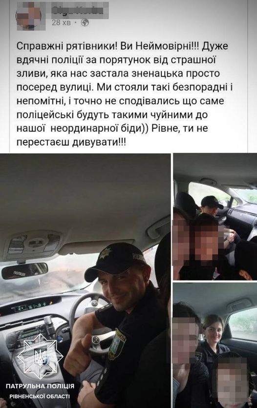 “Дуже вдячні поліції за порятунок від страшної зливи, яка нас застала зненацька просто посеред вулиці. Ми стояли такі безпорадні і непомітні, і точно не сподівались, що саме поліцейські будуть такими чуйними до нашої неординарної біди)) Рівне, ти не перестаєш дивувати!!!”