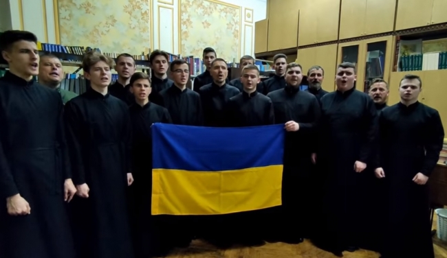 Майбутні священики заспівали пісню, тримаючи український прапор.