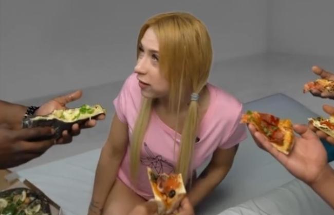Після цього до неї наближаються актори з відкритими коробками з піцою та стають довкола неї.
