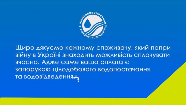 Питання щодо оплати послуг водопостачання та водовідведення можна з’ясувати у оператора за тел. 0800-219-218. “Рівнеоблводоканал” щиро дякує кожному споживачу, який попри війну в Україні знаходить можливість сплачувати вчасно! Адже саме ваша оплата є запорукою цілодобового водопостачання та водовідведення.