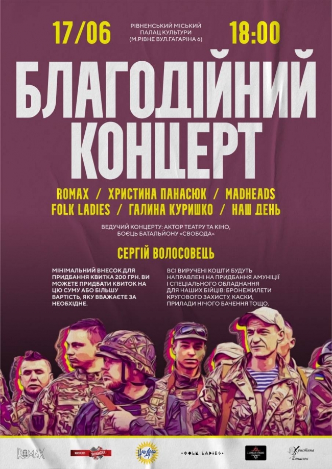 У п‘ятницю, 17 червня, в Рівному відбудеться благодійний концерт на підтримку бійців, які перебувають на фронті.
