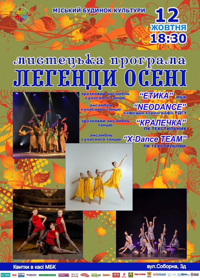 Осінь – це час зустрічатися з друзями, щоб розповідати дивні історії, слухати джаз та мріяти. Та неодмінно танцювати!Під звуки дощу чи вітру, під шелест листя чи серпанкову тишу. Під свою улюблену осінню мелодію. А якщо ви любите танець, але не вмієте танцювати, то приходьте подивитись як це робить зразковий ансамбль сучасного танцю “Етика” під керівництвом Руслани Мартинюк. Традиційна вражаюча і завжди непередбачувана мистецька програма “Легенди осені” нікого не залишить байдужим.