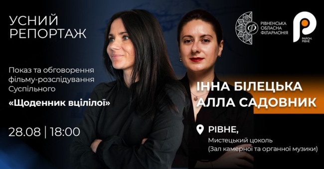У Рівному відбудеться показ та обговорення фільму-розслідування «Щоденник вцілілої» за участі авторок фільму: шеф-редакторки редакції розслідувань Суспільного Інни Білецької та журналістки Алли Садовник, – повідомили у Рівненській обласній філармонії.