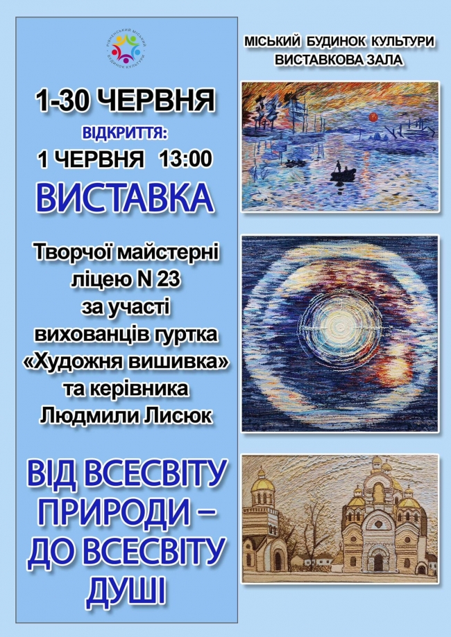 Виставку презентує Творча майстерня ліцею №23 за участі вихованців гуртка «Художня вишивка» та керівника Людмили Лисюк.