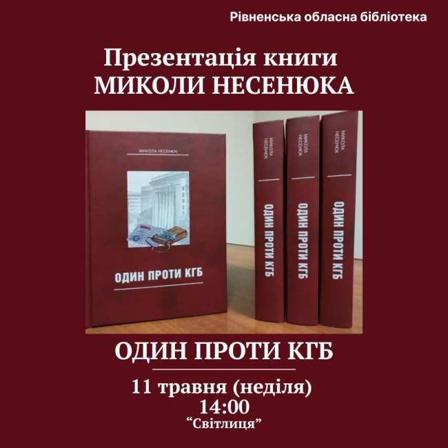 11 травня о 14:00 у Рівненській обласній універсальній науковій бібліотеці відбудеться презентація захоплюючого роману відомого рівненського журналіста Миколи Несенюка — «Один проти КГБ».