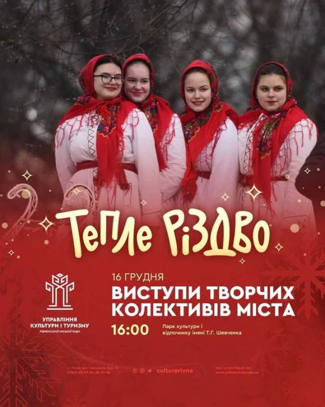 16 грудня о 16:00 години там розпочнуться виступати дивовижних рівненських колективів, які зігріють серце та подарують радісний настрій на весь вечір. Також чекатимуть теплі напої, частування та яскраві локації.